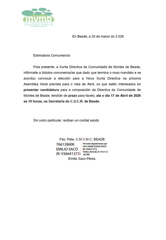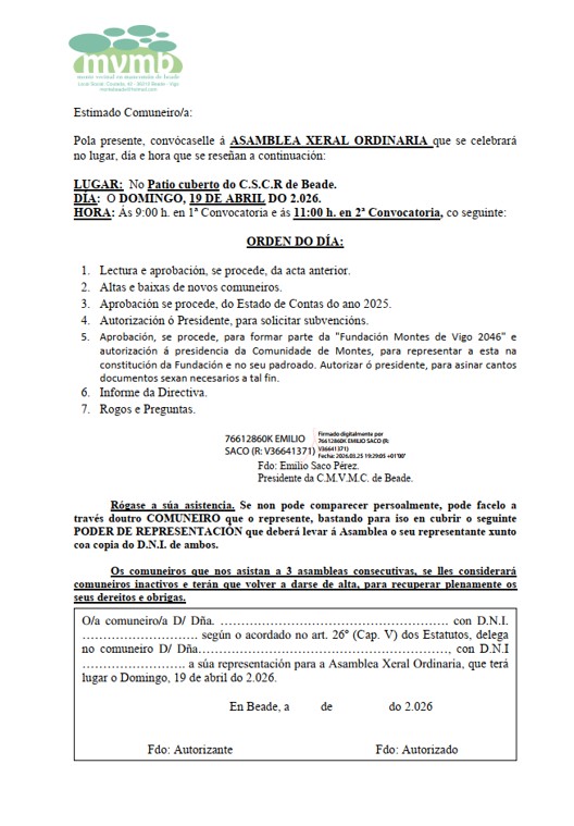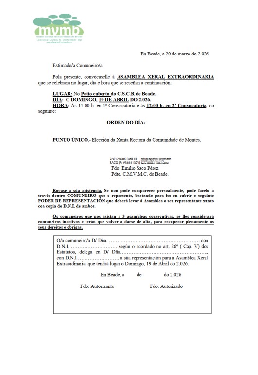 A Xunta Directiva da Comunidade de Montes en Mancomún de Beade convoca a tódolos comuneiros/ras á Asemblea Xeral Ordinaria, que se celebrará o domingo 06/04/2025 no Auditorio do C.S.C.R de Beade.